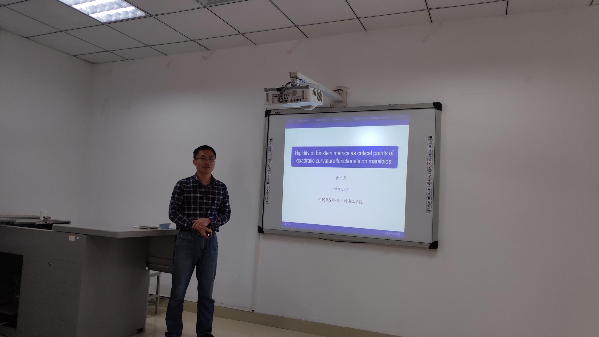 5月9日上午8点-10点,河南师范大学黄广月教授应邀来我校创新楼206讲学。理学部部分老师认真聆听了学术报告。