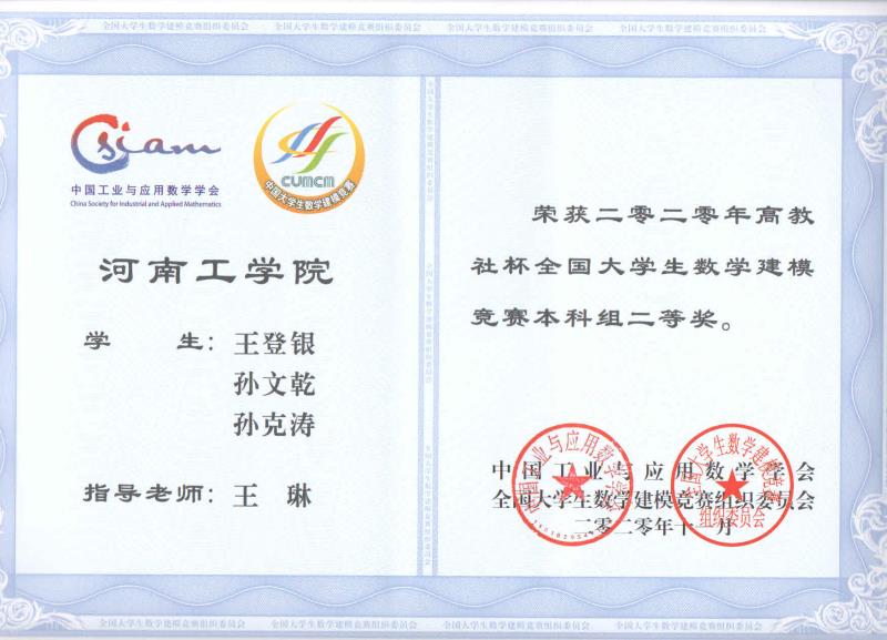 近日,经河南省组委会和全国组委会两轮匿名评审,2020年全国大学生数学建模竞赛成绩于近日揭晓,我校再次取得优异佳绩。24支参赛队伍中有23队获奖,其中,全国二等奖2项,省级一等奖8项,省级二等奖8项,省级三等奖5项,综合获奖率高达95.8%,竞赛成绩和获奖比例位列河南省同类本科院校前列。