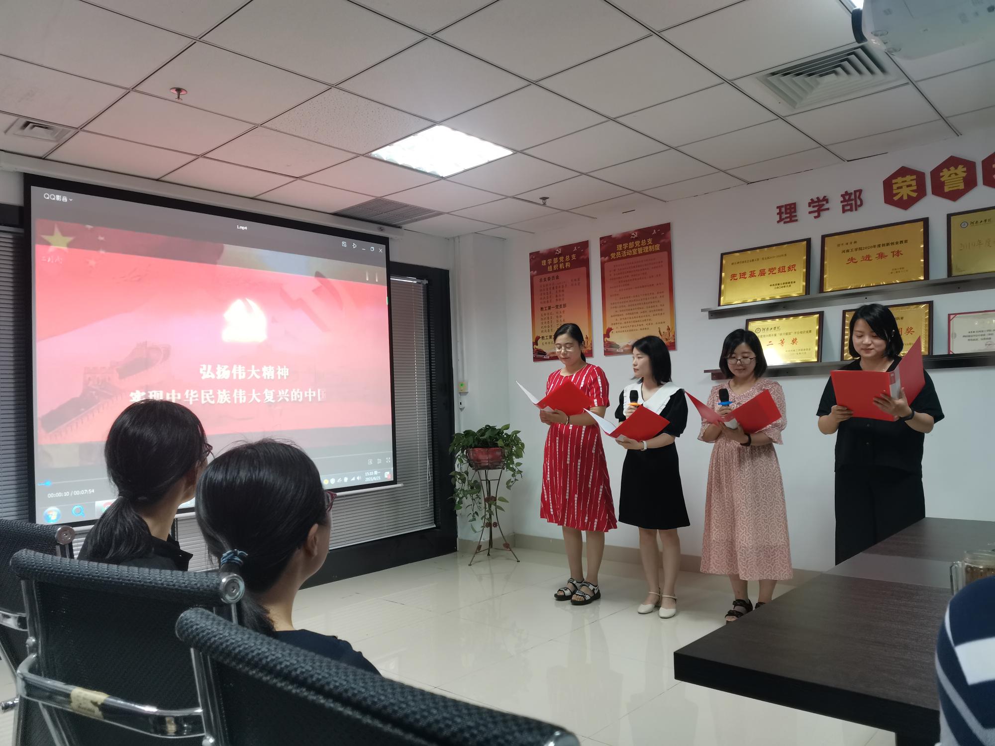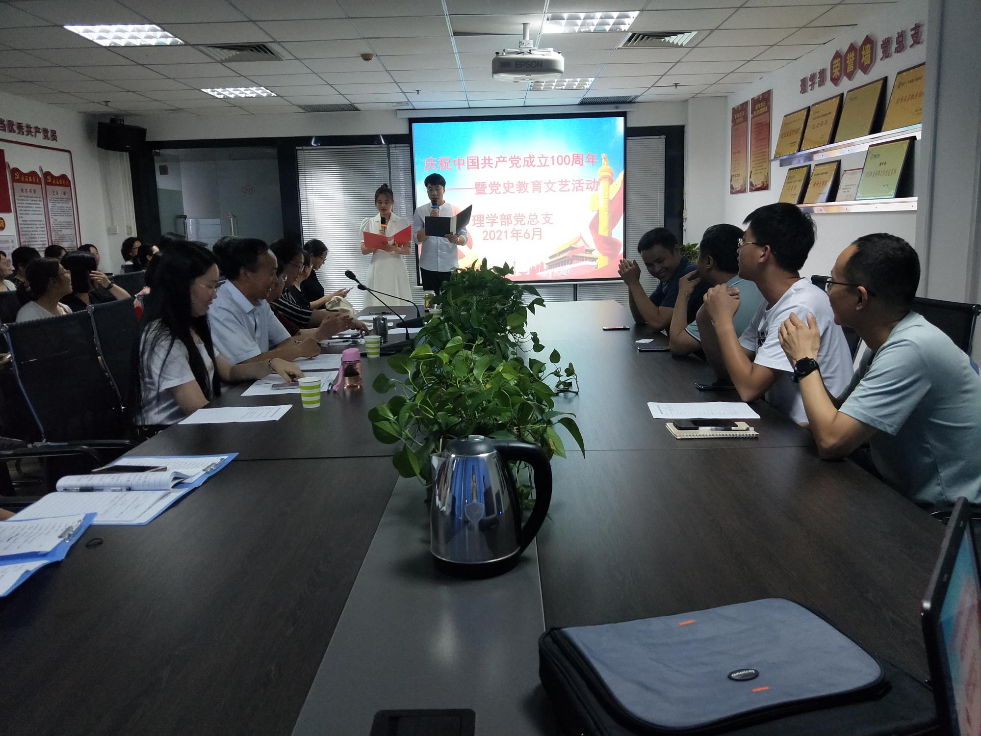 6月21日下午,理学部党总支在党员活动室举行了“庆祝中国共产党成立100周年暨党史学习教育主题文艺活动”,热烈庆祝中国共产党成立100周年。邀请了马克思主义学院杨玉春副院长和艺术设计学院李夏老师参加活动,对节目进行指导和点评。理学部领导和全体教职工观看了文艺汇演。