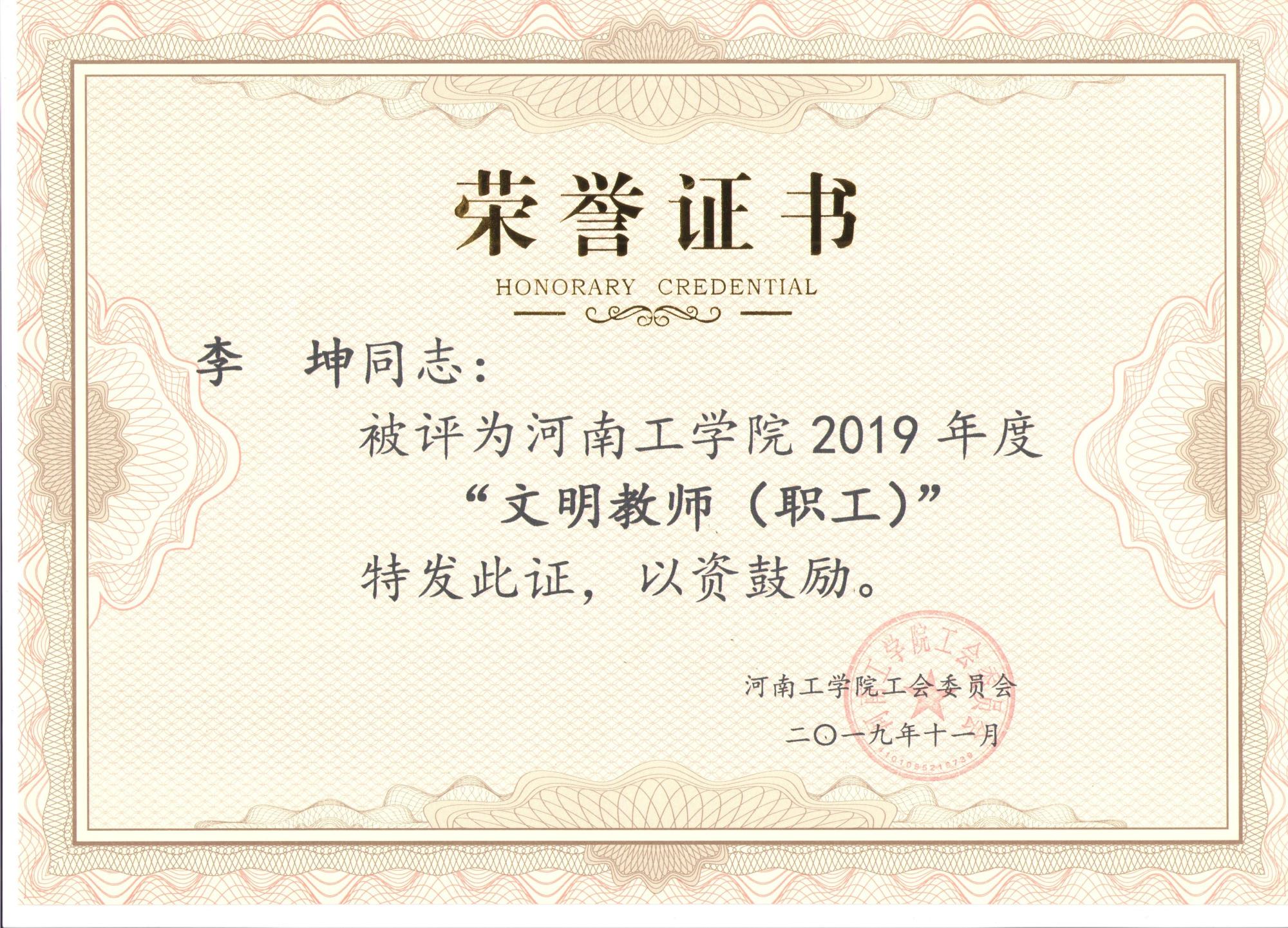 近日,校工会公布了2019年度文明教师(职工)评选结果,我部李坤老师被评为“文明教师”。